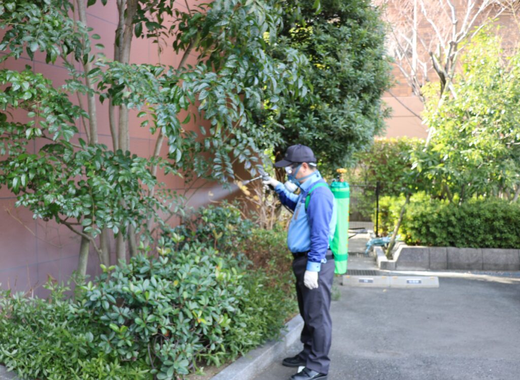 敷地内の、成虫の蚊が生息している場所に薬剤を散布し駆除します。